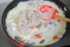 そこへ①、カニ缶を加えて煮立ったら火を止める。
