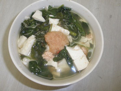 水溶き片栗粉を加えてトロミをつけ、モロヘイヤを加える。